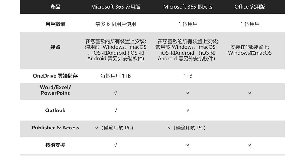 一個訂閱組合,有齊你日常所需的進階Office應用程式、額外的雲端儲存、先進的保安設定以及更多功能。