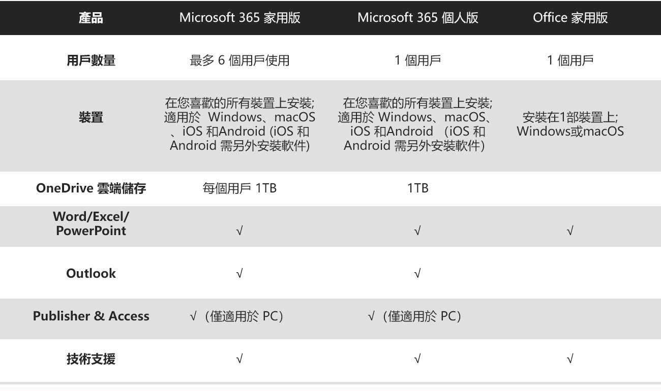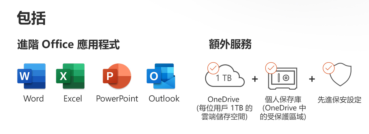 一個訂閱組合,有齊你日常所需的進階Office應用程式、額外的雲端儲存、先進的保安設定以及更多功能。